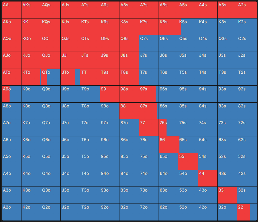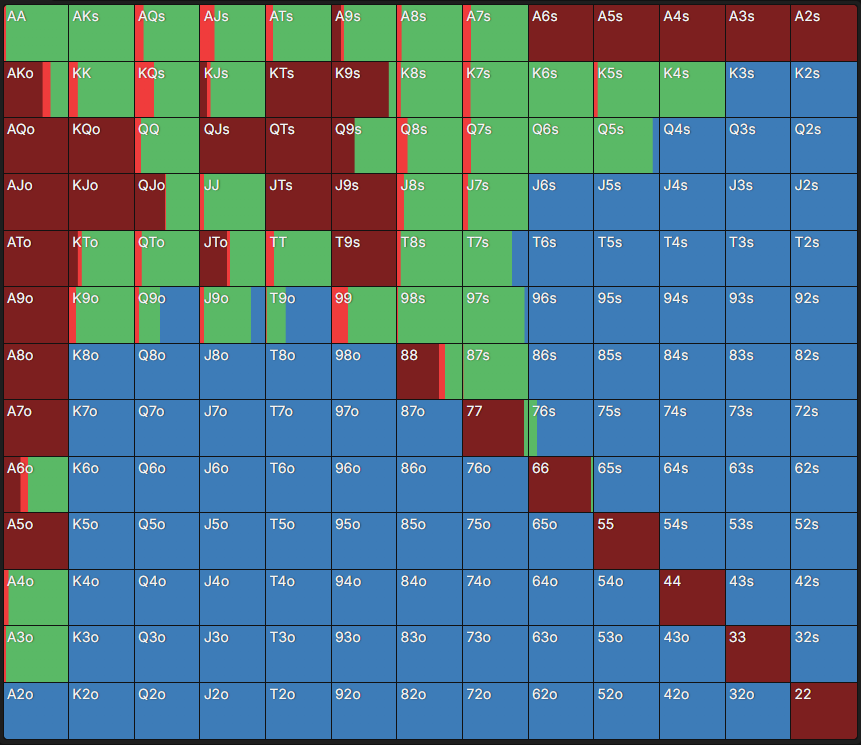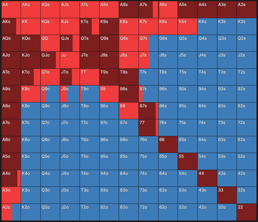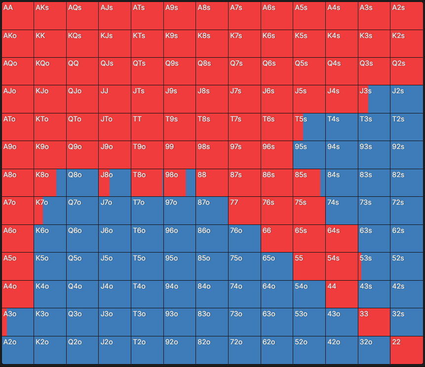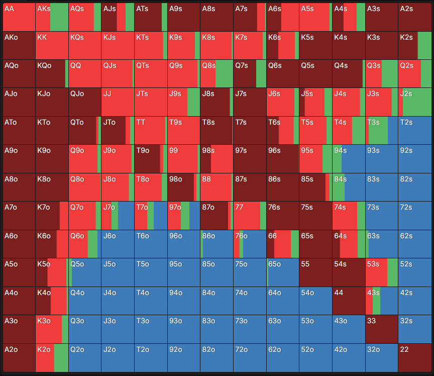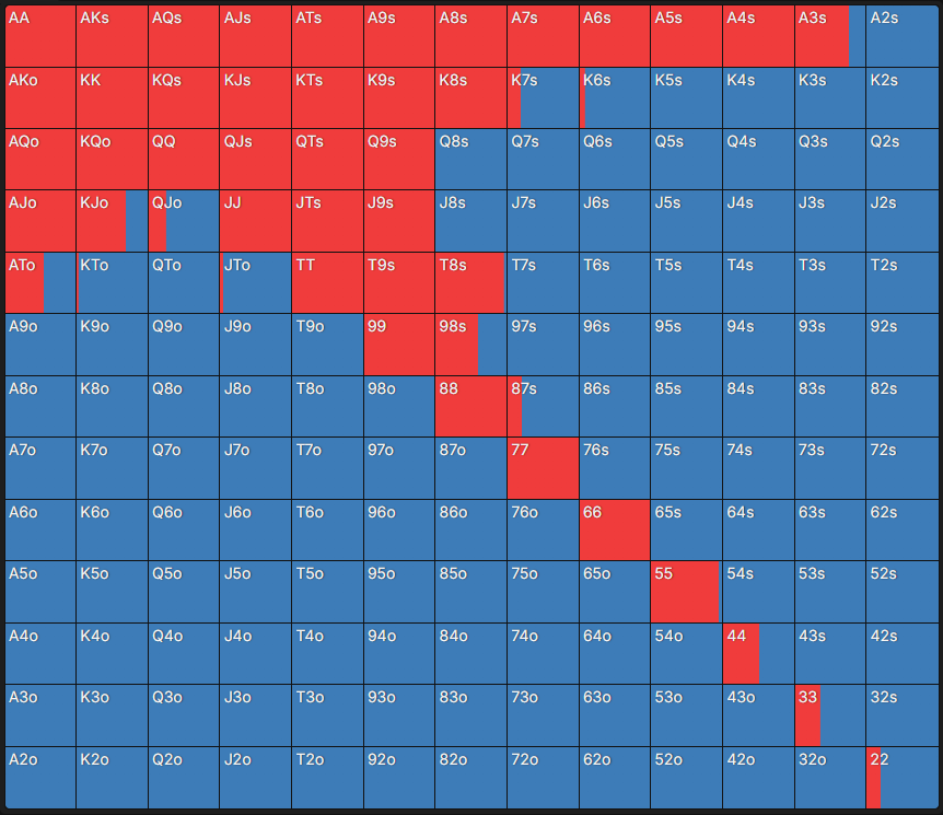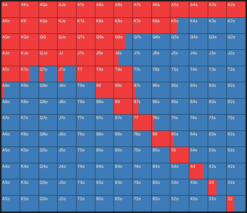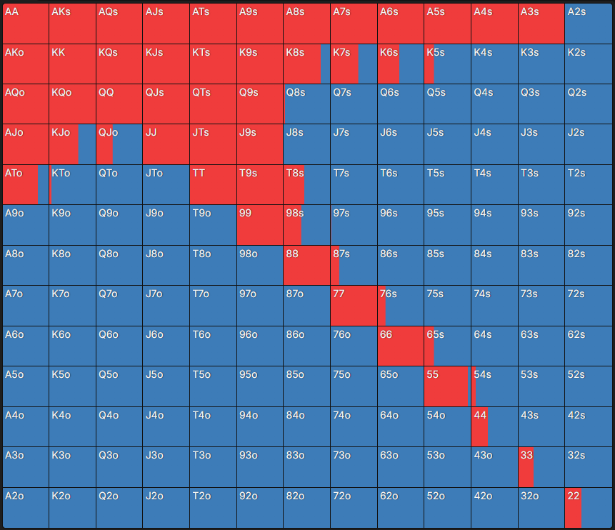 Чарт – це таблиця, яка містить 169 стартових комбінацій у Техаському Холдемі: одномасні (s – suited) руки – внизу ліворуч, різномасні (o – offsuit) – вгорі праворуч, а кишенькові пари – по діагоналі. Кожна клітинка має кольорове позначення, що відповідає рекомендованій дії. Достатньо знайти в таблиці потрібну стартову руку – і можна побачити, яка дія оптимальна відповідно до позиції та ефективного стека.
