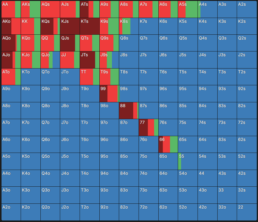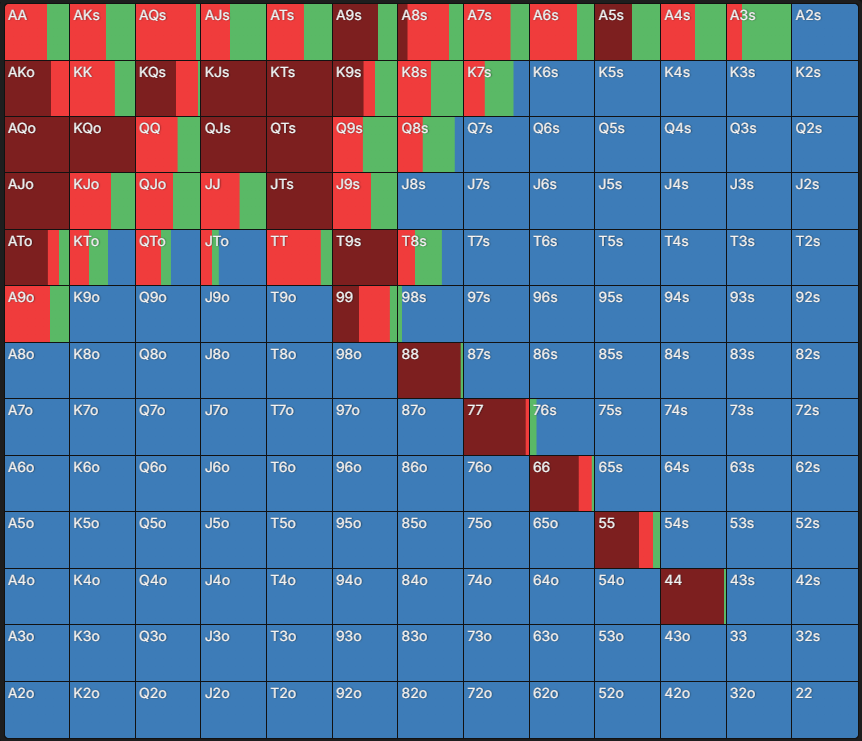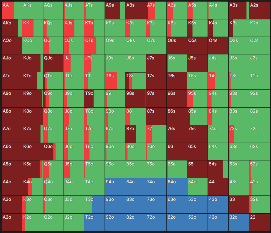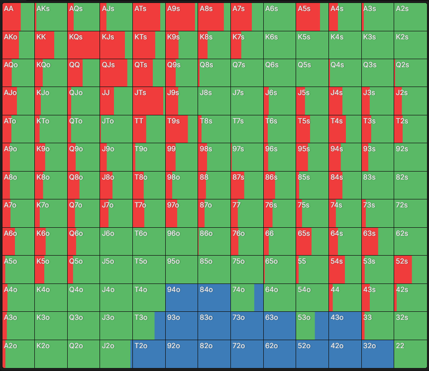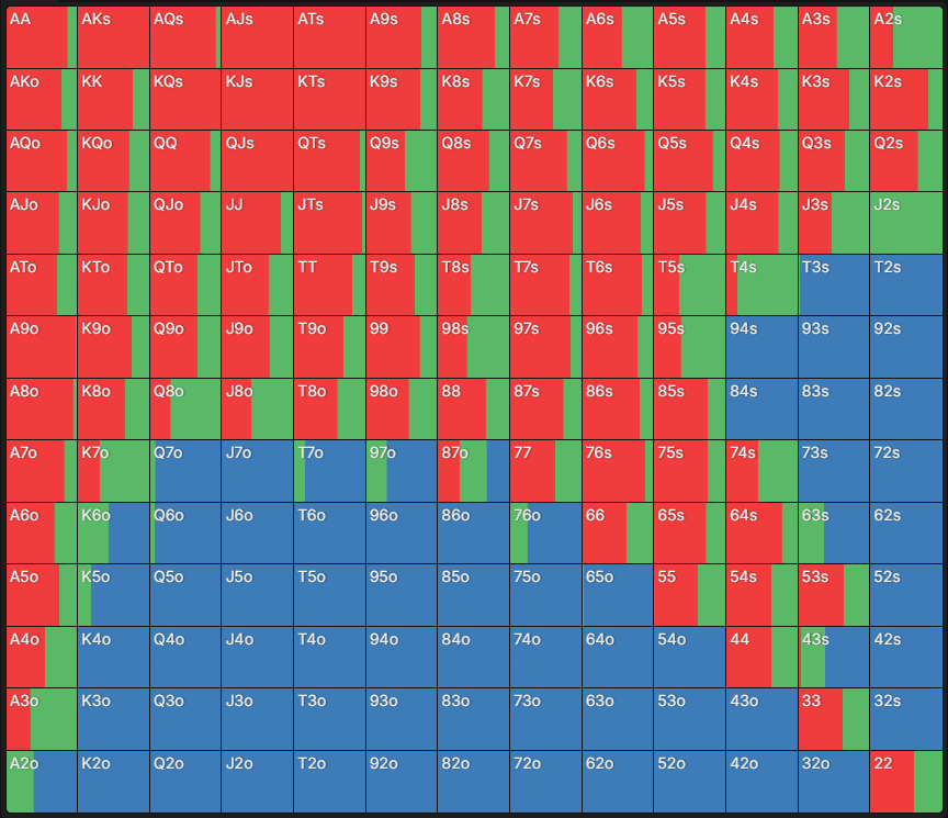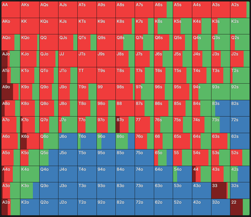 У чартах, які створені за допомогою GTO-програм, деякі клітинки зафарбовані частково або кількома кольорами – таким чином GTO-модель “міксує” стратегії. На практиці це означає, що кожна з рекомендованих дій може використовуватися із певною частотою.