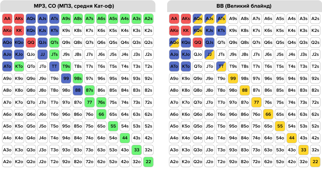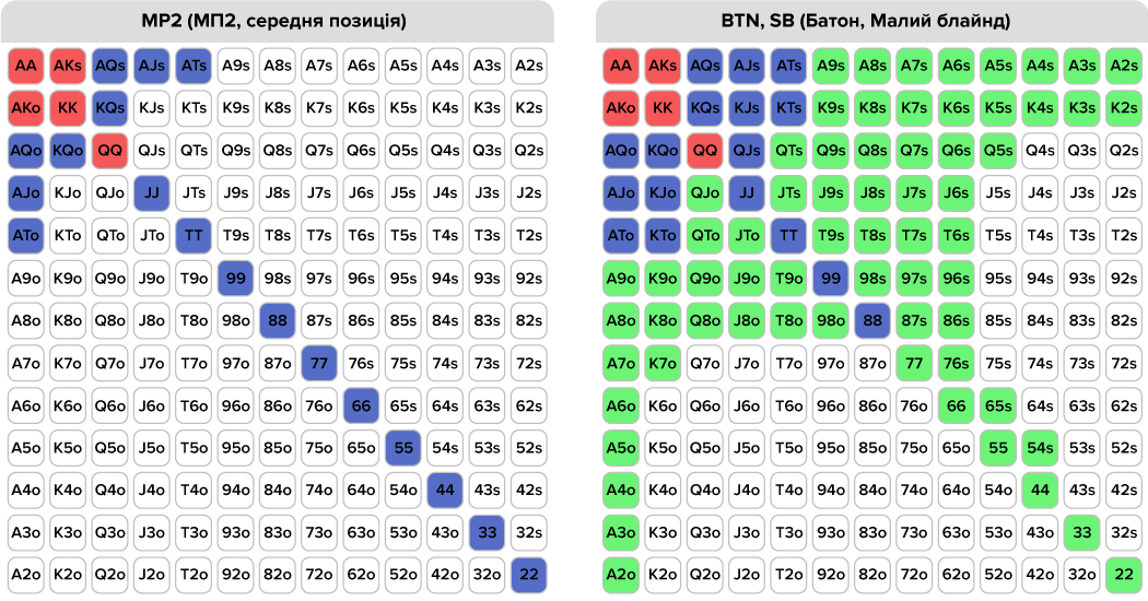 - Зеленим позначені слабкі руки, з якими гравцю найчастіше буде вдаватися красти блайнди. Розігрувати їх варто лише тоді, коли ніхто не увійшов у роздачу.
